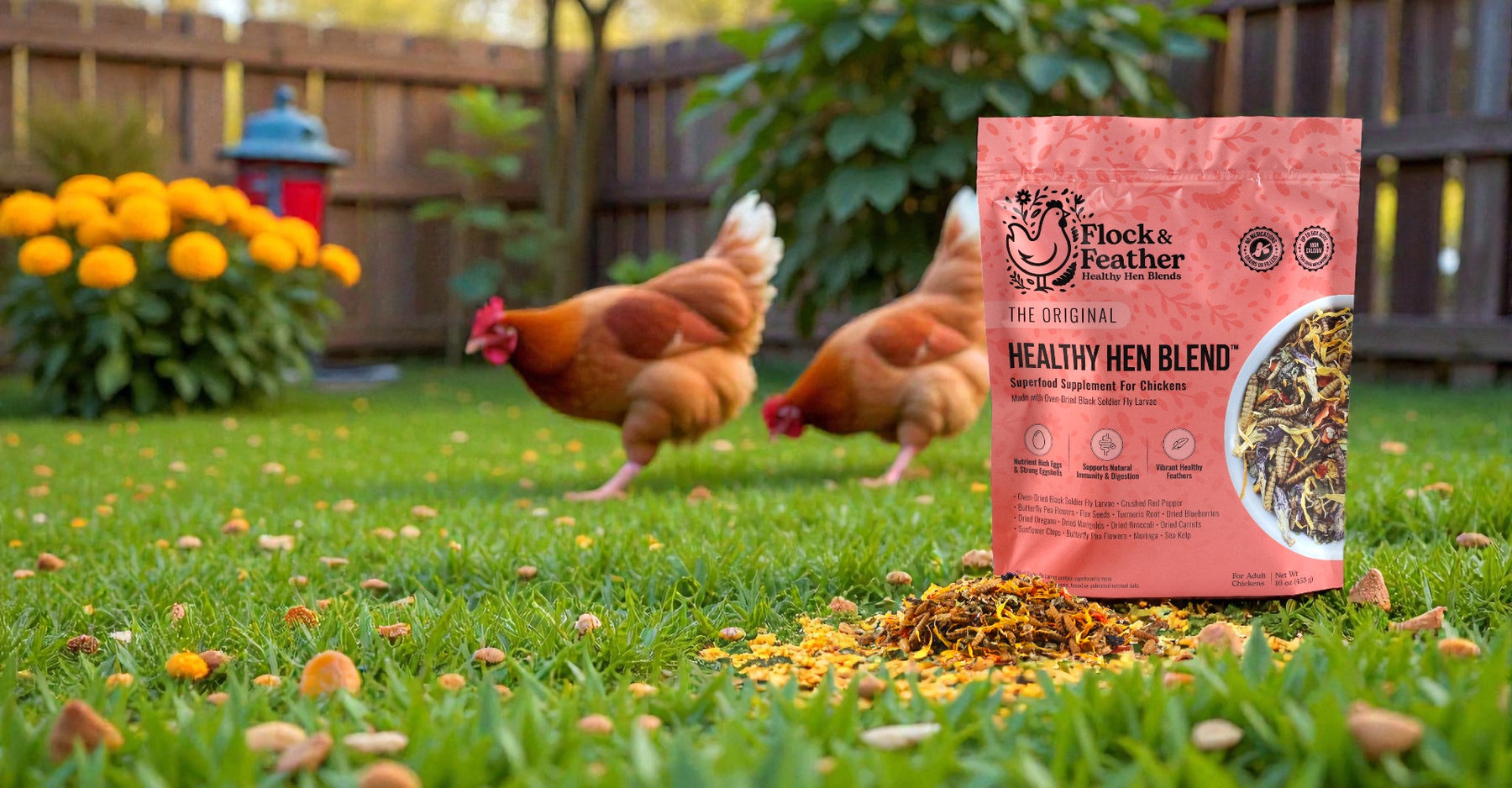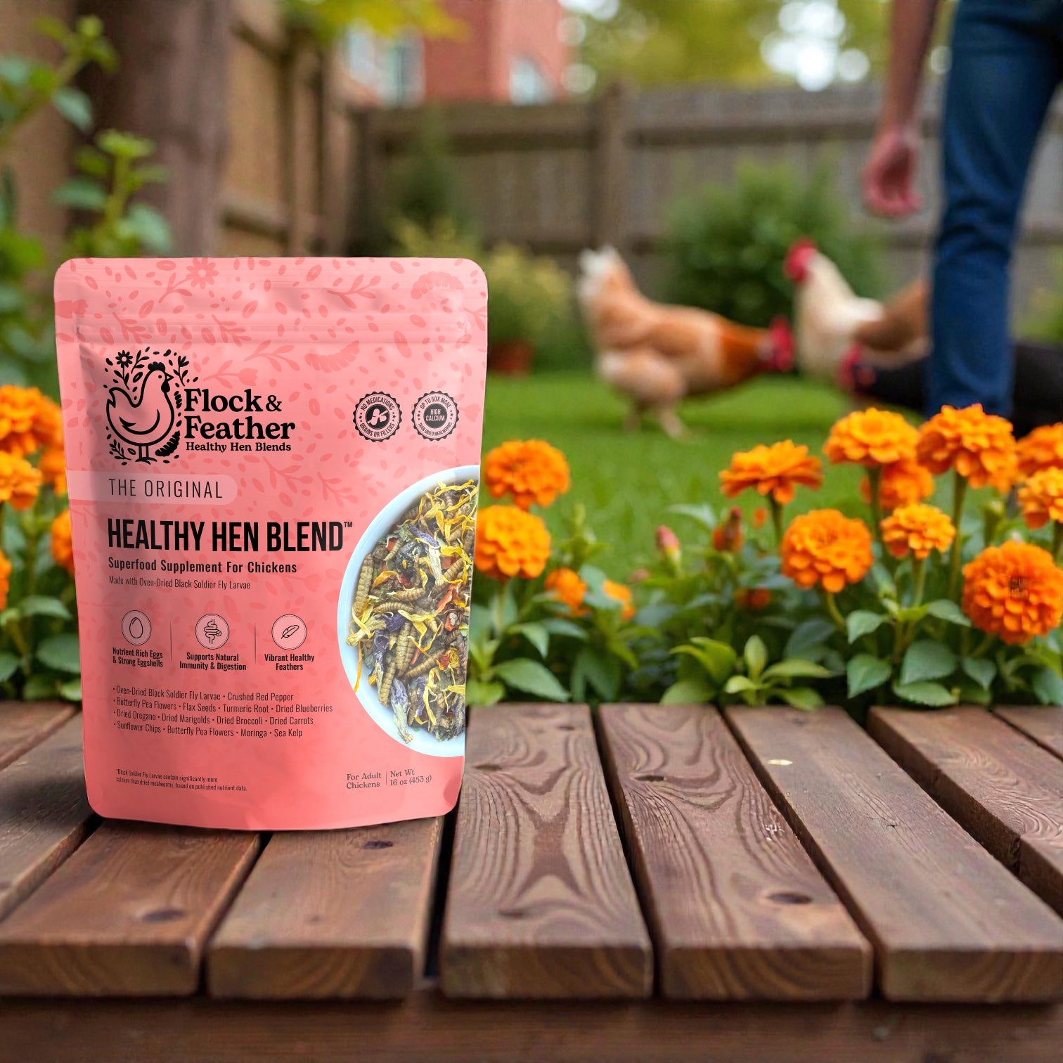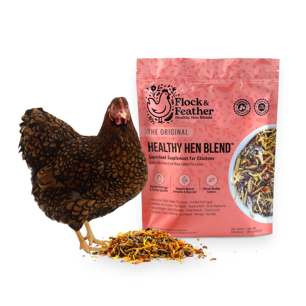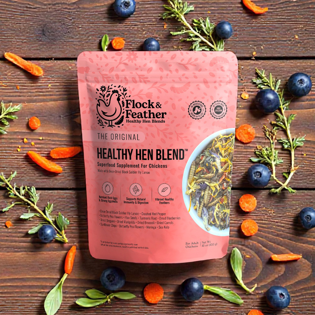 Don’t settle for basic feed or dusty treats. The Original Healthy Hen Blend™ is crafted with calcium-rich black soldier fly larvae, herbs and veggies to support stronger eggs, shinier feathers, and better digestion — naturally.